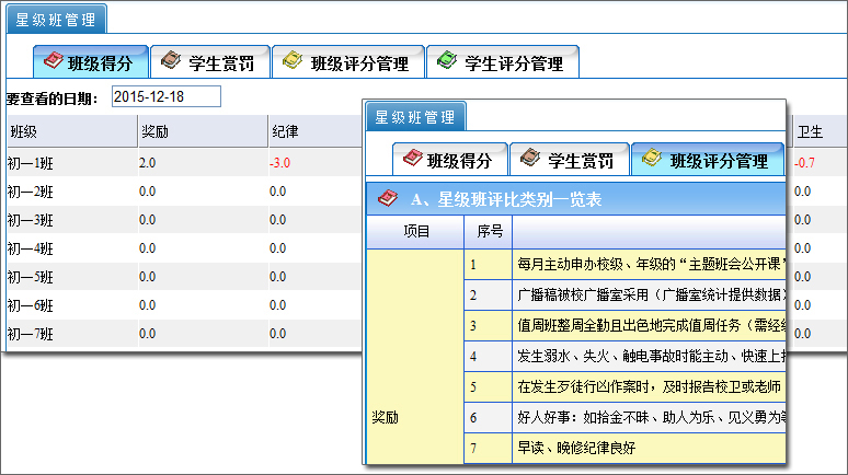 將學(xué)校班級德育劃分為獎勵、紀律、禮儀、兩操、考勤、衛(wèi)生、班主任執(zhí)行力等八大項,三十多個小項進行管理,對班級中的個人獎懲,班級獎懲進行量化管理,專人打分,專人審核,自動匯總,形成月報表、周報表、期報表。同樣原理,將宿舍管理也分為衛(wèi)生、內(nèi)務(wù)、紀律等各個方面對宿舍內(nèi)的學(xué)生或宿舍整體進行量化考評管理,宿舍的得分對整個班級的得分有一定比例的影響,影響的程度可以根據(jù)學(xué)校要求設(shè)定。